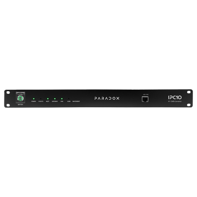 The IPC10 is designed to receive Ethernet IP Data from Paradox systems, convert them from Paradox encrypted IP protocol to CID format via Sur-Gard MLR2-DG or Ademco 685 protocols, and send them over Ethernet to the central monitoring station (CMS) software. IPC10 offers a high account capacity of up to 5,000 accounts. Created for the modern CMS with a small footprint, low power consumption,and single-wire connection.